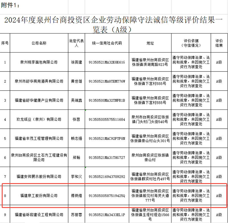 近日,根據(jù)《泉州臺商投資區(qū)管理委員會民生保障局關于開展2024年度企業(yè)勞動保障守法誠信等級評價的通知》(泉臺管民生文〔2025〕11號)文件規(guī)定,經(jīng)嚴格審核,福建泉工股份有限公司(以下簡稱“泉工股份”)被評定為“2024年度企業(yè)勞動保障守法誠信等級A級企業(yè)”,成為全區(qū)25家獲此殊榮的企業(yè)之一。